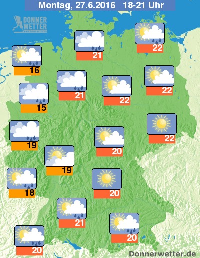 Am späteren Abend schauert es zwischen Unterfranken und Nordseeküste phasenweise, im restlichen Bundesgebiet bleibt es bei wechselnder Bewölkung häufig trocken. Im Erzgebirge sowie in Ostfriesland kann der Himmel auch aufklaren, um 19 bis 16 Grad C.