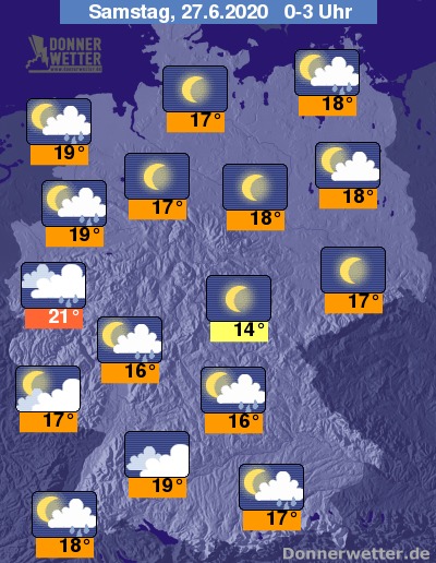 Während der zweiten Nachthälfte treten insbesondere in einer Zone vom Münsterland, quer über die Mitte unseres Landes, bis zur Oberpfalz noch lokale Regengüsse auf. In den übrigen Landesteilen leuchten Mondsichel und Sterne, im Nordosten von einem meist blankgeputzten, im Südwesten im Wechsel mit einigen Wolken vom Himmel.