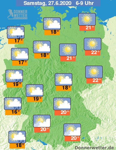 Der Samstag startet östlich der Elbe mit viel Sonnenschein; in den übrigen Landesteilen zeigt sich der Himmel überwiegend heiter bis wolkig, südlich der Donau zeigen sich auch kompaktere Wolken. Vor allem entlang der Rheins muss in den Morgenstunden immer wieder mit Schauern gerechnet werden, sonst bleibt es meist trocken.