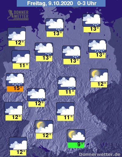 Bis zu den Frühstunden kühlt die Luft auf 13 bis 9 Grad ab, am mildesten bleibt es mit Werten um 14 Grad noch unter den dichten Regenwolken in der Kölner Bucht.