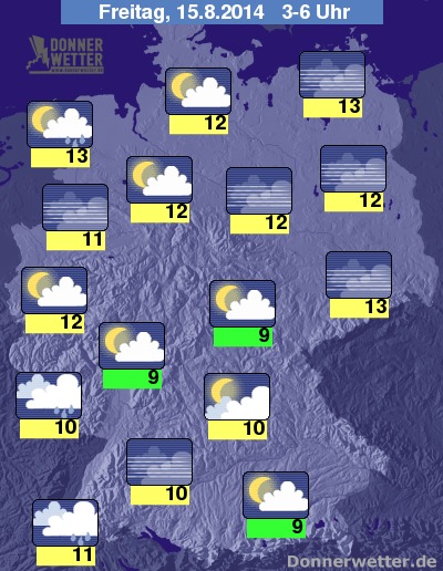 In der Nacht zum Freitag klingen die einzelnen Schauer nach und nach weiter ab. Im Westen und Südwesten werden die Wolken allerdings dichter und es fällt gelegentlich Regen, sonst bleibt es bei meist aufgelockerter Bewölkung aber meist trocken. Stellenweise bildet sich Nebel. Die Temperatur sinkt auf 13 Grad in Rostock und etwa 9 Grad im Odenwald.