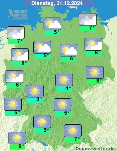 Am Dienstag zeigt sich das Wetter über dem Süden und Osten verbreitet heiter bis sonnig. Dagegen bleibt es im Norden und Westen vielerorts trüb, jedoch kann es auch auflockern. In Küstennähe ist vereinzelt etwas Regen möglich, sonst bleibt es aber trocken. Die Temperatur steigt auf 3 Grad am Randes des Westerwaldes und bis 9 Grad am Oberrhein. Im Norden weht ein oft starker, an der See ein verbreitet auch stürmischer Wind.
