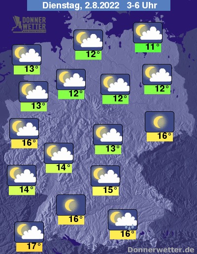 In der Nacht zum Dienstag ist es vor allem im Süden zunächst stark bewölkt und es bilden sich vielerorts Schauer, die im Laufe der zweiten Nachthälfte abklingen. Im übrigen Land ist es meist locker bis aufgelockert bewölkt, teils auch sternenklar, dazu bleibt es trocken. Die Temperatur sinkt auf 17 Grad in Freiburg und etwa 11 Grad in Rostock.
