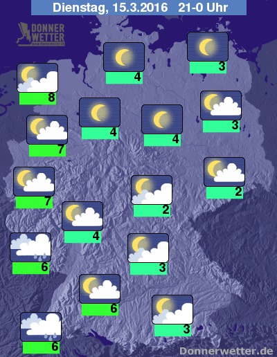 Heute Abend fällt im äußersten Süden noch gebietsweise Regen, Schneeregen oder Schnee, dabei ist lokal Glätte möglich. Über der übrigen Südhälfte ist es hier und da stark, meist jedoch nur noch locker bis aufgelockert bewölkt und dazu weitgehend trocken. Weiter nach Norden hin zeigt sich der Himmel zum Großteil sternenklar, vor allem nach Osten hin ziehen aber auch oft einige Wolken durch, dabei bleibt es trocken. Die Abendtemperatur liegt bei 8 Grad in Emden und um 2 Grad im Leipziger Land.