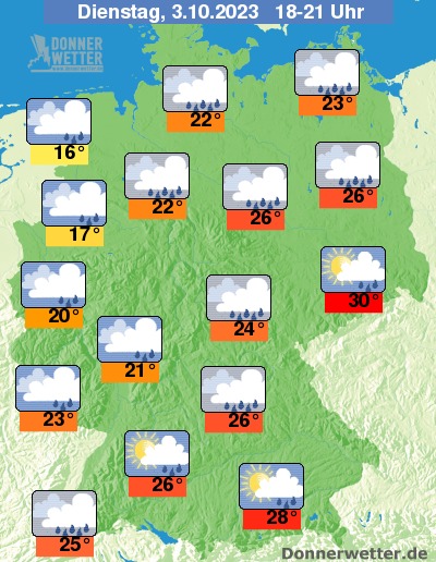 Heute Abend erreicht die Schauerfront auch den Süden und Osten der Republik, seltene Gewitter sind dabei nicht ausgeschlossen. Auch im übrigen Land ist es häufig stark bewölkt, dazwischen kann es aber auch auflockern. Es bilden sich zeitweise Schauer. Die Temperatur liegt bei 16 Grad in Emden und bis zu 30 Grad in Dresden.