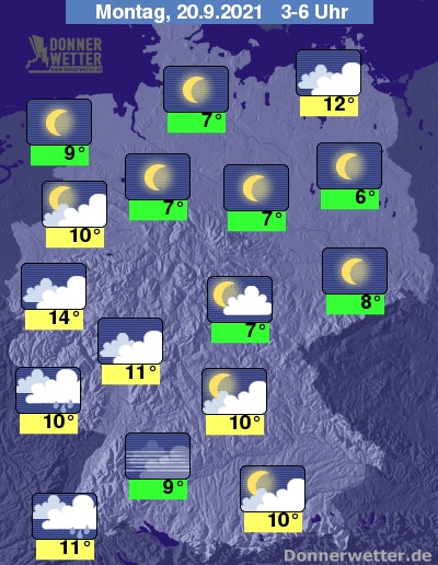 In der bevorstehenden Nacht ist der Himmel über der Südwesthälfte des Landes und über dem Ostseeumfeld überwiegend stark, teils auch aufgelockert bewölkt, dazu können sich vereinzelt Schauer bilden. Im Rest der Republik ist es meist sternenklar und es bleibt trocken. Die Temperatur sinkt auf 14 Grad in Köln und bis 6 Grad in Berlin.