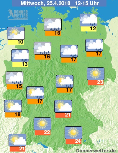 Heute Nachmittag ist es über dem Süden Deutschlands und über Sachsen verbreitet sonnig und trocken, sonst ziehen hingegen verbreitet kompakte Wolken durch und es bilden sich wiederholt Schauer. Vor allem an den Küsten sind aber auch heitere Abschnitte und lange trockene Phasen möglich. Die Temperatur liegt bei 10 Grad an der Nordseeküste und 24 Grad in München.