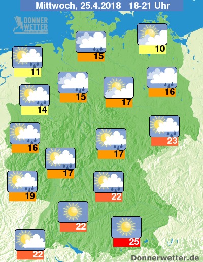 Heute Abend ist es im Süden weiterhin heiter bis sonnig und weitgehend trocken, sonst wechselnd sich lockere und dichte Wolken einander ab und es können sich gebietsweise Schauer bilden. Die Temperatur liegt bei nur 10 Grad auf Rügen und noch bis 25 Grad in München.