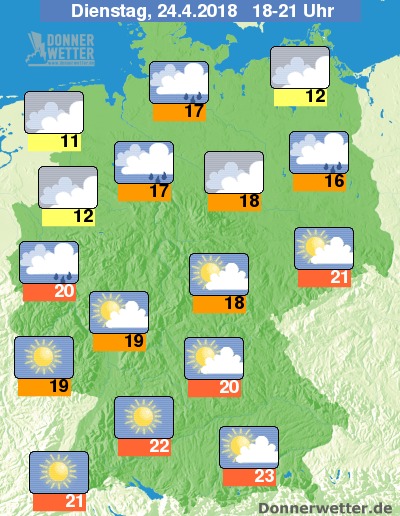 Heute Abend zeigt sich der Süden heiter bis sonnig und trocken. Über der breiten Landesmitte bleibt es zwar meist noch trocken, jedoch nimmt die Bewölkung hier ingesamt zu. Dichte Wolken halten sich über dem Norden des Landes, dazu fällt gebietsweise Regen. Die Temperatur liegt bei kühlen 11 Grad in Bremerhaven und bis 23 Grad im Raum München.