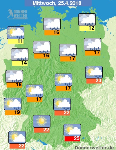 Am Mittwoch ist es im Süden verbreitet heiter oder sonnig und dazu trocken. Im übrigen Bundesgebiet ist es hingegen überwiegend stark bewölkt und es bilden sich zeitweise Schauer. Die Temperatur steigt auf frische 11 Grad in Aurich und bis 25 Grad in München.