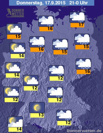 Heute Abend lockert die Bewölkung in den westlichen Bundesländern mehr und mehr auf und die Niederschläge klingen von Westen her ab. Dagegen bleibt es über der Osthälfte der Republik auch bis Mitternacht weitgehend bedeckt und es fällt zeitweise und auch oft langanhaltender Regen. Die Abendtemperatur liegt bei 17 Grad in Vorpommern und etwa 12 Grad im Saargau.