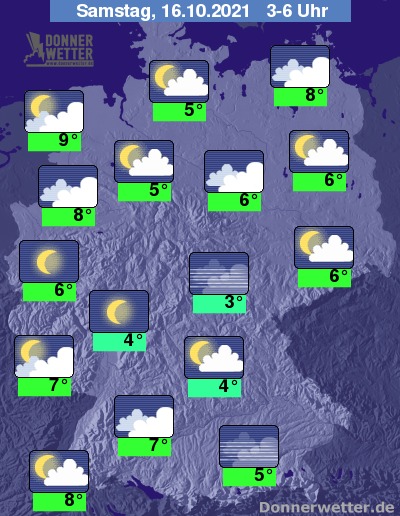 In der kommenden Nacht zeigt sich der Himmel von der breiten Mitte des Landes bis in den Süden meist gering bewölkt oder sternenklar, hier und da sind auch mehr Wolken möglich. Im Norden ist es hingegen oft stark bewölkt, hier und da zeigen sich Auflockerungen. Es bleibt landesweit trocken bei Tiefstwerten von 9 Grad in Bremerhaven und bis 3 Grad in Jena.