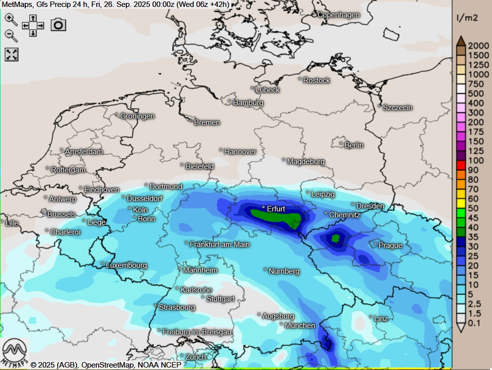 Die Strömungs- und Temperaturkarte für Donnerstagmorgen (06:00 Uhr) sowie die 24-Stunden-Regenmengen am Donnerstag nach GFS: