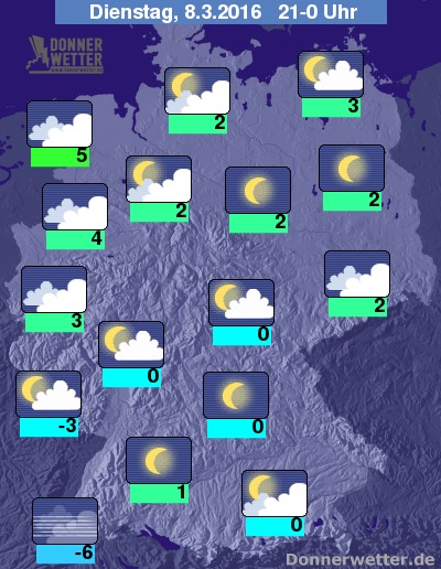 Heute Abend bleibt es nach Nordwesten hin meist stark bewölkt, jedoch trocken. Weiter nach Südosten hin zeigt sich der Himmel dagegen oft nur locker bewölkt oder sogar sternenklar, dabei bleibt es ebenfalls trocken. Die Abendtemperatur liegt bei 5 Grad im Emsland und etwa -6 Grad am Schwarzwald.