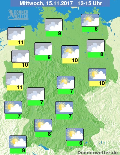 Heute Nachmittag ist es im Süden zumeist heiter, vor allem am Alpenrand oft sonnig und dabei trocken. Besonders im Norden, jedoch auch im Westen halten sich überwiegend dichte Wolken, dabei fällt hier und da etwas Regen. In den übrigen Landesteilen ist es teils aufgelockert, teils stark bewölkt und überwiegend trocken. Die Temperatur liegt bei 6 Grad in München und bis 11 Grad in Köln.