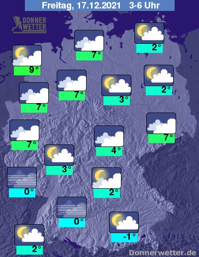 In der folgenden Nacht hält sich vor allem über der Nordhälfte oft dichte Bewölkung, vielerorts ist es aber auch nur locker bis wechselnd bewölkt. Es bildet sich stellenweise Nebel. Die Temperatur sinkt auf 9 Grad an der Nordsee und bis -1 Grad im Berchtesgadener Land.