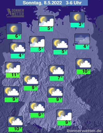 In der folgenden Nacht klingen letzte örtliche Schauer im Süden und der Mitte Deutschlands rasch ab und vor allem im Norden ist es oft sternenklar. Im übrigen Land ist es meist locker bis aufgelockert bewölkt. Die Temperatur sinkt auf 11 Grad in Köln und 3 Grad in Neubrandenburg.