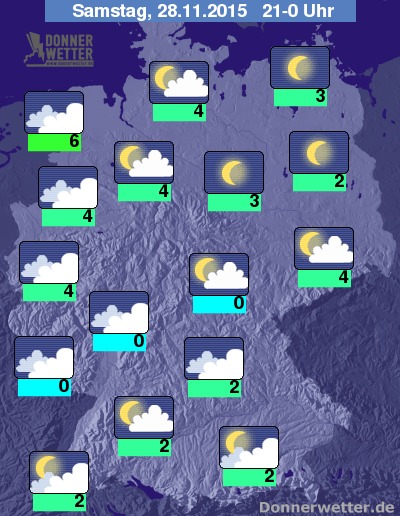 In der Nacht zum Sonntag bleibt es im Süden und auch im Osten meist locker oder aufgelockert bewölkt, teils aber auch stark bewölkt, dabei jedoch trocken. Sonst ziehen von Nordwesten allerdings dichte Wolken mit zeitweiligem Regen und teils auch Schneeregen durch. Die Temperatur sinkt auf 8 Grad in Ostfriesland und bis -1 Grad im Süden Bayerns. Es weht verbreitet frischer bis starker, im Westen und Norden auch stürmischer Wind, an den Küsten und auf den Bergen herrscht teils schwerer Sturm.