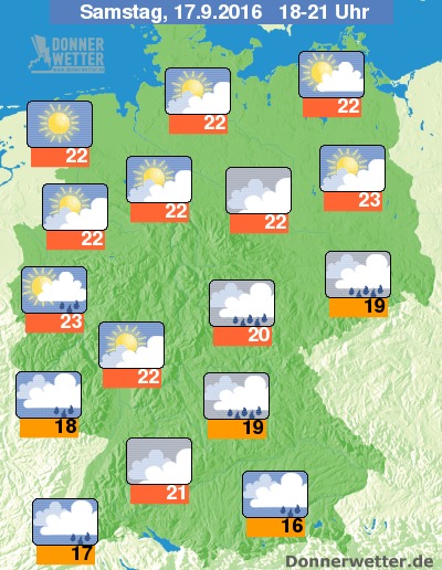 Heute Abend ist es über dem Norden der Republik oft aufgelockert, vor allem an den Küsten überwiegend auch nur locker bewölkt und dazu trocken. Meist bedeckt mit teils kräftigem und langanhaltendem Regen ist es über Bayern, Thüringen und Sachsen. In den restlichen Landesteilen ist es meist stark, teils auch aufgelockert bewölkt und dabei weitgehend trocken. Die Temperatur liegt bei 16 Grad in München und bis 23 Grad in Berlin.
