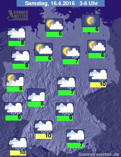 In der Nacht zum Samstag bleibt es im Süden bei dichter Bewölkung und zeitweisem Regen, aber auch über der breiten Mitte und dem Nordwesten des Landes ist es oft stark bewölkt und es können sich einzelne Schauer bilden. Im Norden und Nordosten ist es meist nur locker oder aufgelockert bewölkt, zum Teil auch sternenklar und es bleibt überwiegend trocken. Die Temperatur sinkt auf 10 Grad in Freiburg und bis 6 Grad in Neubrandenburg.