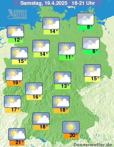 Am Ostersonntag kann sich zwischen lockeren bis noch aufgelockert Wolken häufiger die Sonne zeigen. Im Westen und Südwesten und im Verlauf auch über der übrigen breiten Landesmitte können sich allerdings einzelne Schauer und Gewitter bilden, sonst bleibt es meist niederschlagsfrei. Die Höchstwerte erreichen 13 Grad an der Nordsee und bis 22 Grad in der Niederlausitz.