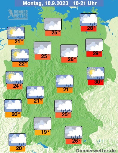 Heute Abend zieht häufig kompakte Bewölkung durch, dazwischen kann es auch auflockern. Es bilden sich gebietsweise Schauer, örtlich auch Gewitter. Die Temperatur liegt bei 19 Grad im Raum Stuttgart und 30 Grad in Dresden.