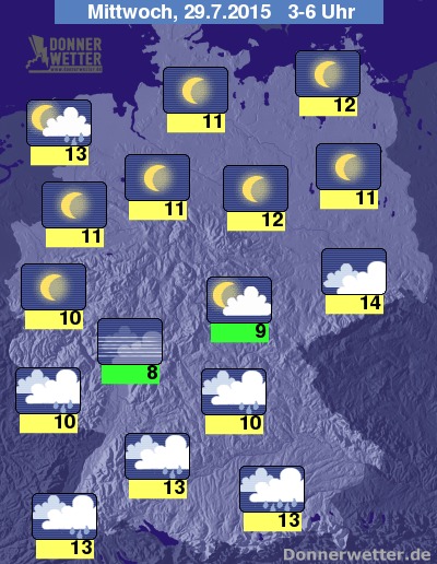 In der folgenden Nacht klart der Himmel über der Nordhälfte der Bundesrepublik verbreitet auf, nur im Nordseeküstenumfeld sind einzelne Schauer und auch Gewitter möglich, sonst bleibt es trocken. Im Süden halten sich dichte Wolken und es fällt zeitweise Regen. In den übrigen Landesteilen ist es teils klar, teils locker bewölkt und trocken. Die Temperatur sinkt auf 13 Grad in Karlsruhe und bis 8 Grad in der Wetterau.