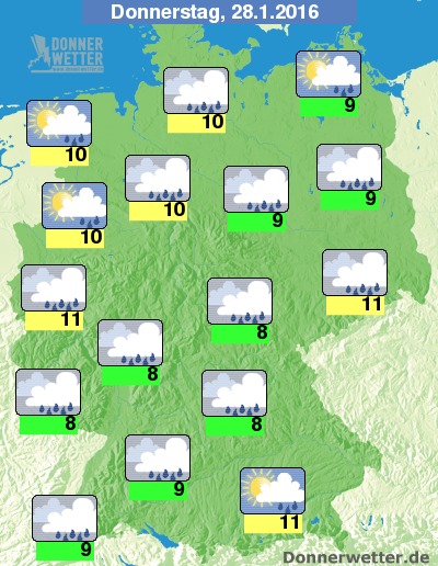 Am Freitag im Norden und Westen weitgehend dichte Wolken und zeitweise Regen oder Sprühregen, im Süden heiter bis sonnig und trocken, sonst wechselnd bewölkt und trocken, 6 bis 10 Grad, im Norden teils Sturm, an den Küsten und auf den Bergen teils schwerer Sturm.