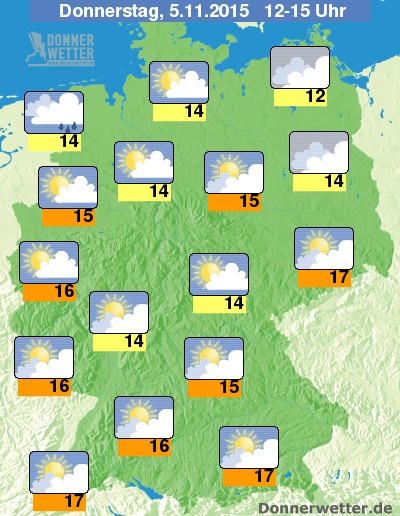 Am Nachmittag ist es in weiten Teilen des Landes wechselnd oder stark bewölkt, heitere Abschnitte finden sich vor allem entlang der Weser sowie am Niederrhein. Die Temperaturen liegen dann bei Werten um 12 Grad C an der Ostseeküste und um 17 Grad C in Dresden.