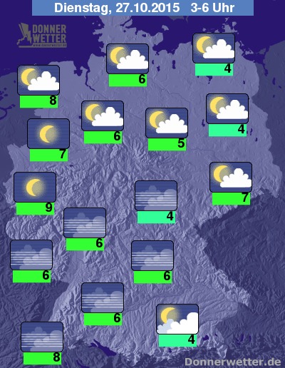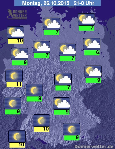 In der Nacht zum Dienstag zieht über den Norden und Osten Deutschlands meist lockere Bewölkung, im großen Rest des Landes ist es hingegen verbreitet sternenklar, jedoch kann sich stellenweise Nebel oder Hochnebel bilden, dabei bleibt es überall trocken. Die Temperatur sinkt auf 9 Grad in Düsseldorf und bis 4 Grad in Nürnberg.