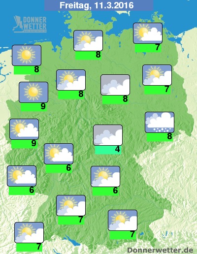 Am Sonntag zeigt sich vor allem nach Süden hin häufig die Sonne, im Norden bleibt es hingegen oft bei vielen und zum Teil auch dichten Wolken, jedoch bleibt es voraussichtlich überall trocken und die Temperaturen steigen sogar auf 7 bis 14 Grad.