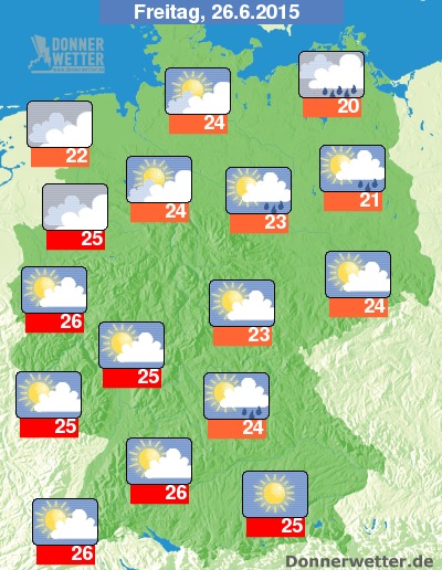 Heiter und trocken zeigt sich der Freitag vor allem im Südwesten des Landes, Schauer sind regional meist nur im Nordosten zu erwarten. Die Temperaturen liegen bei Werten um 20 Grad C an der Ostsee und sommerlichen 26 Grad C im Breisgau.