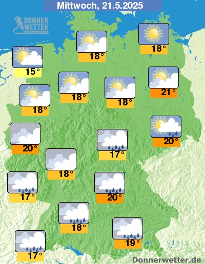 Am Mittwoch zeigt sich der Himmel südlich von Main und Mosel stark bewölkt oder es ist bedeckt, dabei fällt im Tagesverlauf teils schauerartiger Regen. Auch einzelne Gewitter sind möglich. In den übrigen Landesteilen bildet sich am Mittwoch verbreitet Quellbewölkung, vornehmlich an den Küsten sind auch längere heitere oder sonnige Abschnitte zu erwarten, und es bleibt meist trocken.
