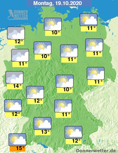 Am Montag ist es häufig stark, teils nur locker bewölkt. Im Süden zeigt sich das Wetter verbreitet heiter, zum Teil sogar sonnig. Es bleibt bundesweit trocken bei Höchstwerten von 10 Grad im Grabfeld und bis 15 Grad im Oberrheingraben.