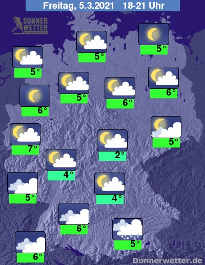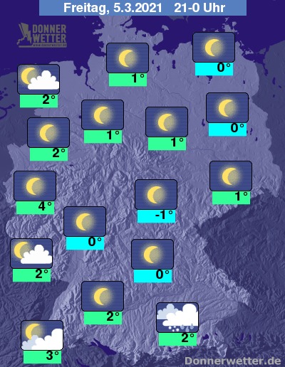 In den Abendstunden zeigt sich der Himmel über weiten Landesteilen locker bewölkt, kompaktere Wolken halten sich zunächst noch im äußersten Süden und Südwesten Deutschlands. Bis auf einzelne Regen-, Schneeregen- oder Schneeschauer im Alpenvorland bleibt es trocken.
