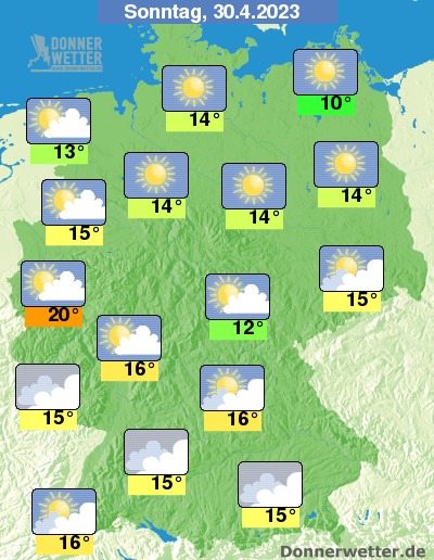 Am Sonntag bleibt es im Süden und über Sachsen noch oft stark bewölkt. Im übrigen Bundesgebiet wird es jedoch verbreitet heiter bis sonnig. Es bleibt überall trocken bei 10 Grad auf Rügen und bis 20 Grad im Rheinland.