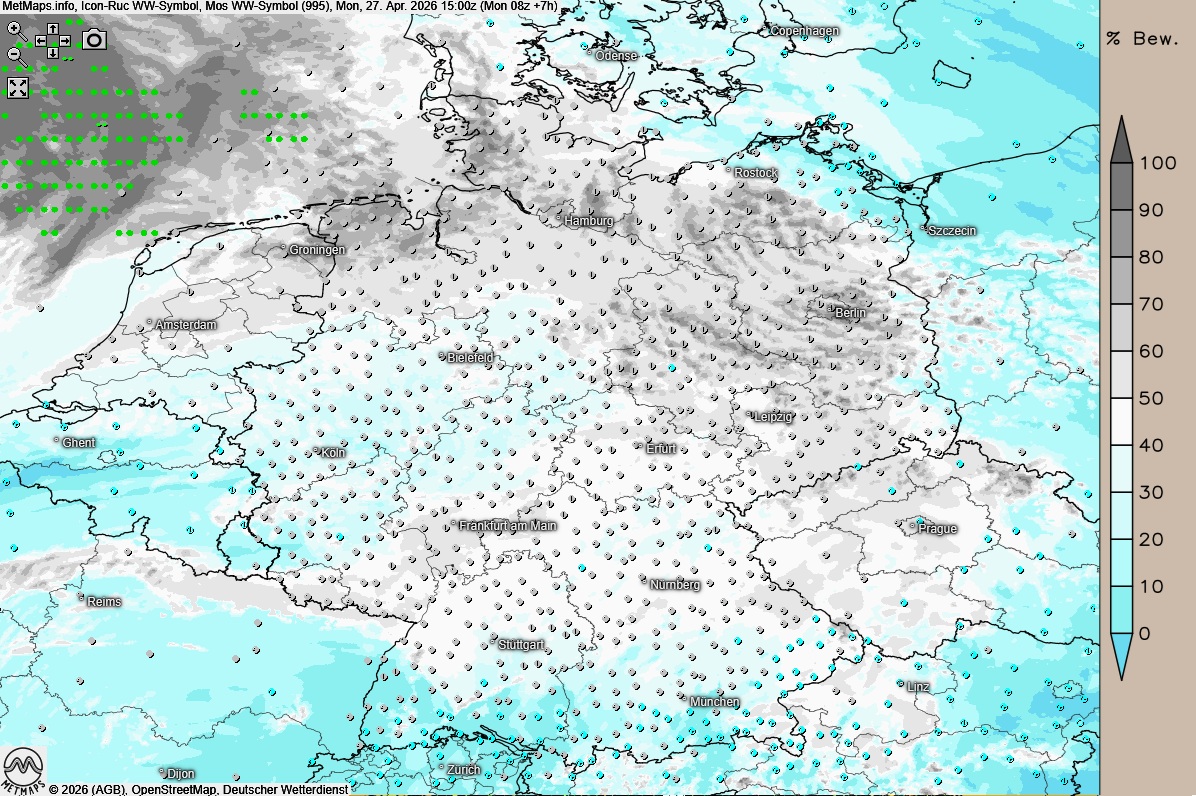 Die Wetter- und Temperaturkarte für Montagnachmittag nach ICON-RUC sowie die Temperaturabweichung für 15:00 Uhr nach ICON: