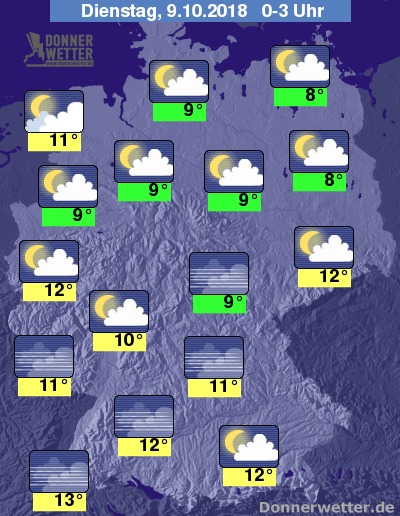 In der Nacht zeigt sich der Himmel in Nordhälfte des Landes weiterhin locker bewölkt; im Süden nimmt die Bewölkung im Nachtverlauf ebenfalls zu, regional kann sich auch Nebel bilden. Schauer sind nicht zu erwarten.