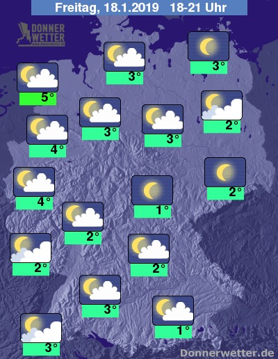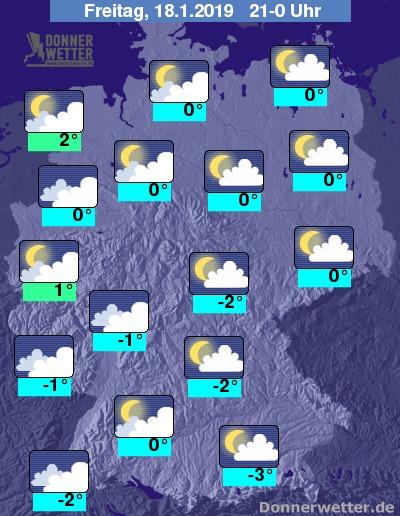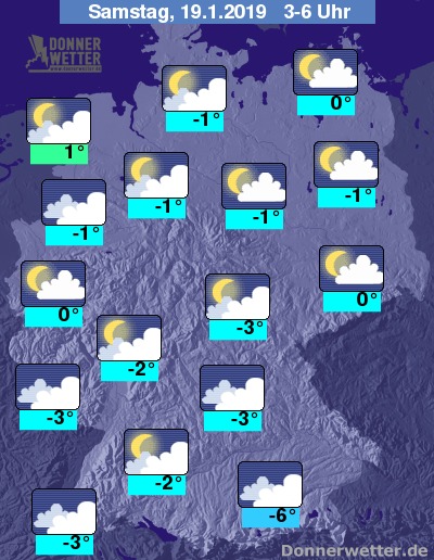 Die Luft kühlt sich bis zu den Frühstunden verbreitet in den leichten, am Alpenrand auch mäßigen Frostbereich zwischen -6 und 0 Grad ab. Leicht positiv bleiben die Temperaturen auf den Inseln und im direkten Küstenbereich.