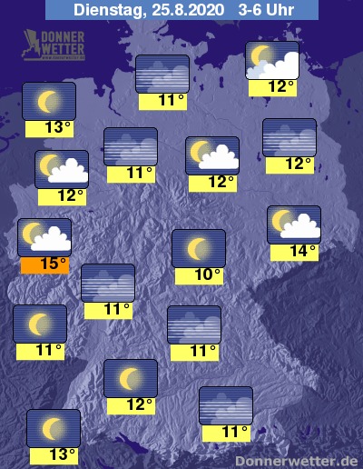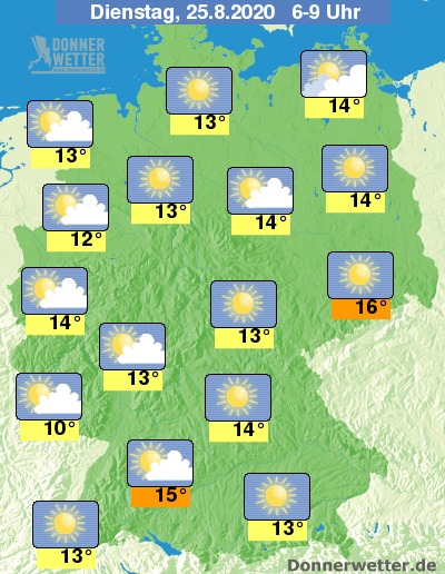 Die Temperaturen erreichen in den Frühstunden Werte um 10 Grad im Saarland und um 16 Grad im östlichen Sachsen.