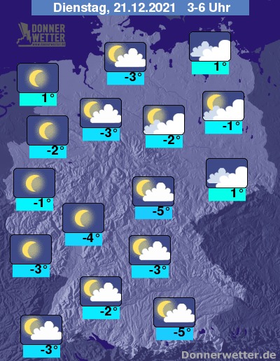 In der Nacht zum Dienstag ist der Himmel oft sternenklar oder nur locker bewölkt. Im Osten und Nordosten halten sich jedoch oft auch dichte Wolken, dazu bleibt es trocken. Die Temperatur sinkt auf 1 Grad in Stralsund und bis -5 Grad in München.