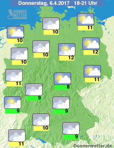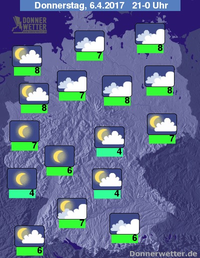 Auch in den späteren Abendstunden dominieren in der Nordhälfte dichte Wolken, weiter südlich zeigt sich der Himmel teils klar, teils locker bewölkt. Die Temperaturen sinken auf Werte um 4 Grad C bis 8 Grad C.