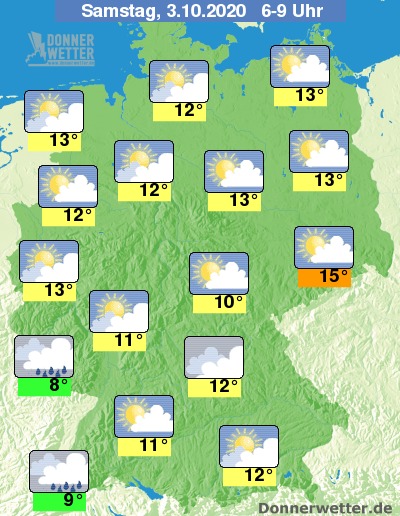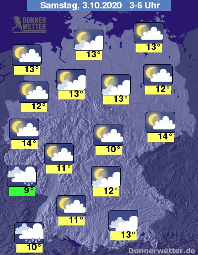 Der Feiertag startet über weiten Landesteilen teils heiter bis wolkig, teils aufgelockert bewölkt. Dichter bewölkt bleibt es in den Frühstunden im Fichtelgebirge sowie im Südwesten. Zwischen Breisgau und Saar fällt dabei auch immer wieder Regen.