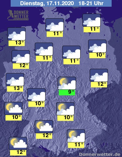 Am Abend halten sich im Norden meist kompakte Wolken, vereinzelt fällt daraus noch etwas Sprühregen. In der Südhälfte lassen teils größere Auflockerungen einen Blick auf die Sterne zu.