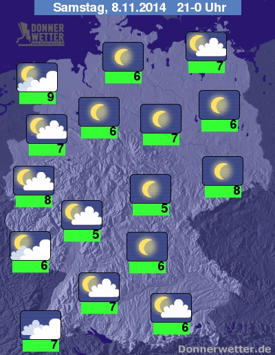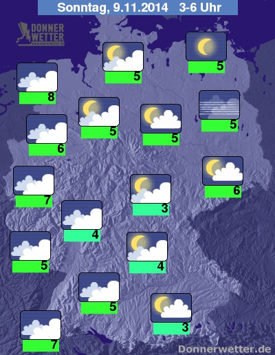 In der Nacht zum Sonntag ist es in der Osthälfte zunächst noch meist sternenklar, im Laufe der Nacht ziehen hier wie bereits zuvor schon in den übrigen Landesteilen einige Wolken auf, nach Westen hin werden die Wolken bis zum Morgen noch dichter, dazu bleibt es jedoch trocken. Nur vereinzelt bildet sich Nebel oder Hochnebel. Die Temperatur sinkt bis zum Morgen auf 8 Grad in Ostfriesland und etwa 3 Grad im Raum München.