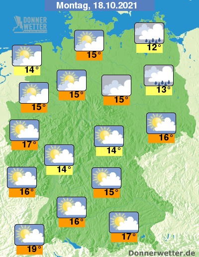 Am Montag zeigt sich das Wetter im Süden vielerorts heiter bis sonnig. Über der breiten Landesmitte ist es teils locker, teils aber auch stark bewölkt oder trüb, auch hier bleibt es trocken. Weiter nach Norden hin zieht weitgehend starke Bewölkung durch, dabei fällt im Nordosten des Landes gebietsweise Regen, sonst bleibt es aber weitgehend trocken. Die Temperatur steigt auf 12 Grad in Rostock und bis zu 19 Grad in Freiburg.
