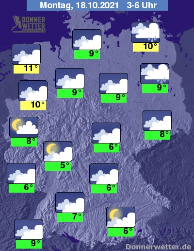 In der bevorstehenden Nacht ziehen vor allem im Norden und Osten kompakte Wolken durch, die hier auch gebietsweise Regen bringen können. Im übrigen Land ist es zumeist stark, hier und da aber auch aufgelockert bewölkt, dazu bleibt es trocken. Die Temperatur sinkt auf 11 Grad in Wilhelmshaven und bis 5 Grad in Wiesbaden.