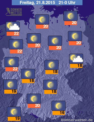 Am Abend hält das Wetter sich konstant. Es bleibt in überwiegend jeder Region ein klarer Abendhimmel zu sehen. In Oberbayern hat das Wetter sich beruhigt nach dem zweitägigen Schauerregen. Im Ostfriesland und der Sächsischen Schweiz ziehen selten Wolken über den Nachthimmel her, ansonsten siehts nach einer klaren Nacht aus.