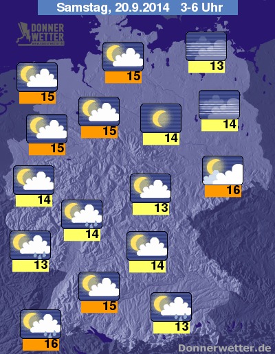 In der Nacht zum Samstag bleibt es im Ostseeumfeld weiterhin meist klar und trocken, sonst bilden sich zunächst gebietsweise weiterer Schauer und Gewitter, diese werden jedoch mit zunehmender Nachtlänge seltener und im Laufe der 2. Nachthälfte klingen die Niederschläge meist ab. Stellenweise bildet sich Nebel oder Dunst. Die Temperatur sinkt auf 16 Grad in Dresden und bis 13 Grad im Allgäu.