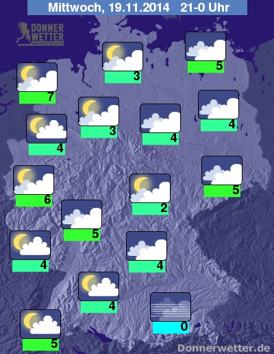 Heute Abend klingen auch die Niederschläge im Osten und Südosten des Landes weitgehend ab, dabei kann sich jedoch besonders im Südosten des Landes gebietsweise Nebel bilden. Vor allem in der Osthälfte des Landes ist es noch meist stark oder dicht bewölkt, allerdings weitgehend trocken. Weiter nach Westen hin zieht hingegen meist lockere bis aufgelockerte, teils aber auch noch starke Bewölkung durch, dazu bleibt es trocken. Die Abendtemperatur liegt bei 7 Grad in Ostfriesland und etwa 0 Grad am Alpenrand, dabei kann es durch den vorherigen Regen stellenweise zu gefährlicher Glätte durch überfrierende Nässe kommen.
